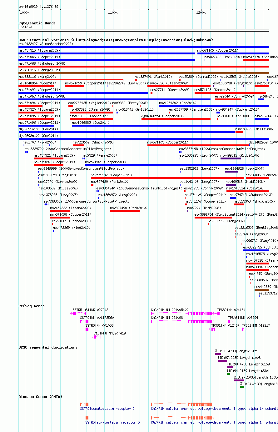 Variant DetailsVariant: nsv1042758| Internal ID | 18785289 | | Landmark | | | Location Information | | | Cytoband | 16p13.3 | | Allele length | | Assembly | Allele length | | hg38 | 283495 | | hg19 | 283496 | | hg18 | 283496 |