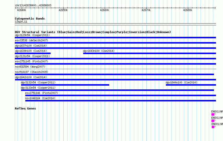 Variant DetailsVariant: nsv1042786| Internal ID | 18785317 | | Landmark | | | Location Information | | | Cytoband | 13q14.11 | | Allele length | | Assembly | Allele length | | hg38 | 48204 | | hg19 | 48204 | | hg18 | 48204 |