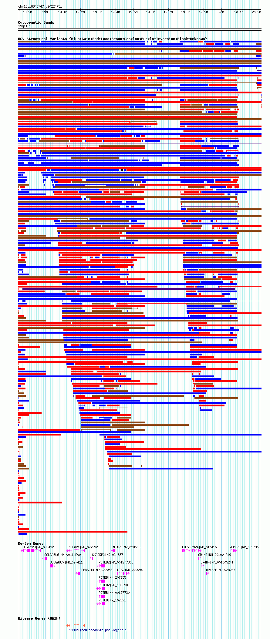 Variant DetailsVariant: nsv1042931| Internal ID | 19132150 | | Landmark | | | Location Information | | | Cytoband | 15q11.1 | | Allele length | | Assembly | Allele length | | hg38 | 1926763 | | hg19 | 2086655 | | hg18 | 1378005 |