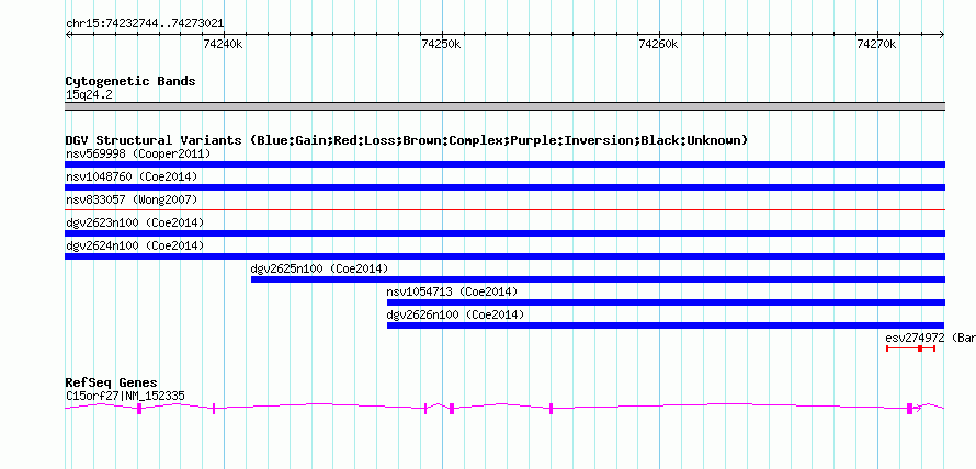Variant DetailsVariant: nsv1043026| Internal ID | 19132245 | | Landmark | | | Location Information | | | Cytoband | 15q24.2 | | Allele length | | Assembly | Allele length | | hg38 | 40278 | | hg19 | 40278 | | hg18 | 40278 |