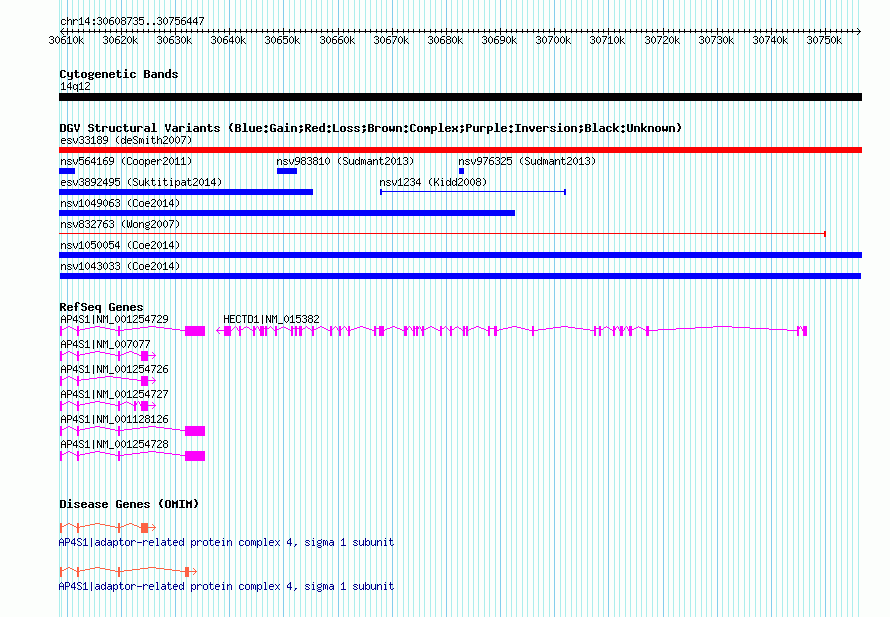 | | Variant Type | CNV gain | | Copy Number | | | Allele State | | | Allele Origin | | | Probe Count | | | Validation Flag | | | Merged Status | M | | Merged Variants | | | Supporting Variants | nssv3528587 | | Samples | | | Known Genes | AP4S1, HECTD1 | | Method | SNP array | | Analysis | Affymetrix SNP array copy number analysis | | Platform | Affymetrix SNP Array 6.0 | | Comments | | | Reference | Coe_et_al_2014 | | Pubmed ID | 25217958 | | Accession Number(s) | nsv1043033