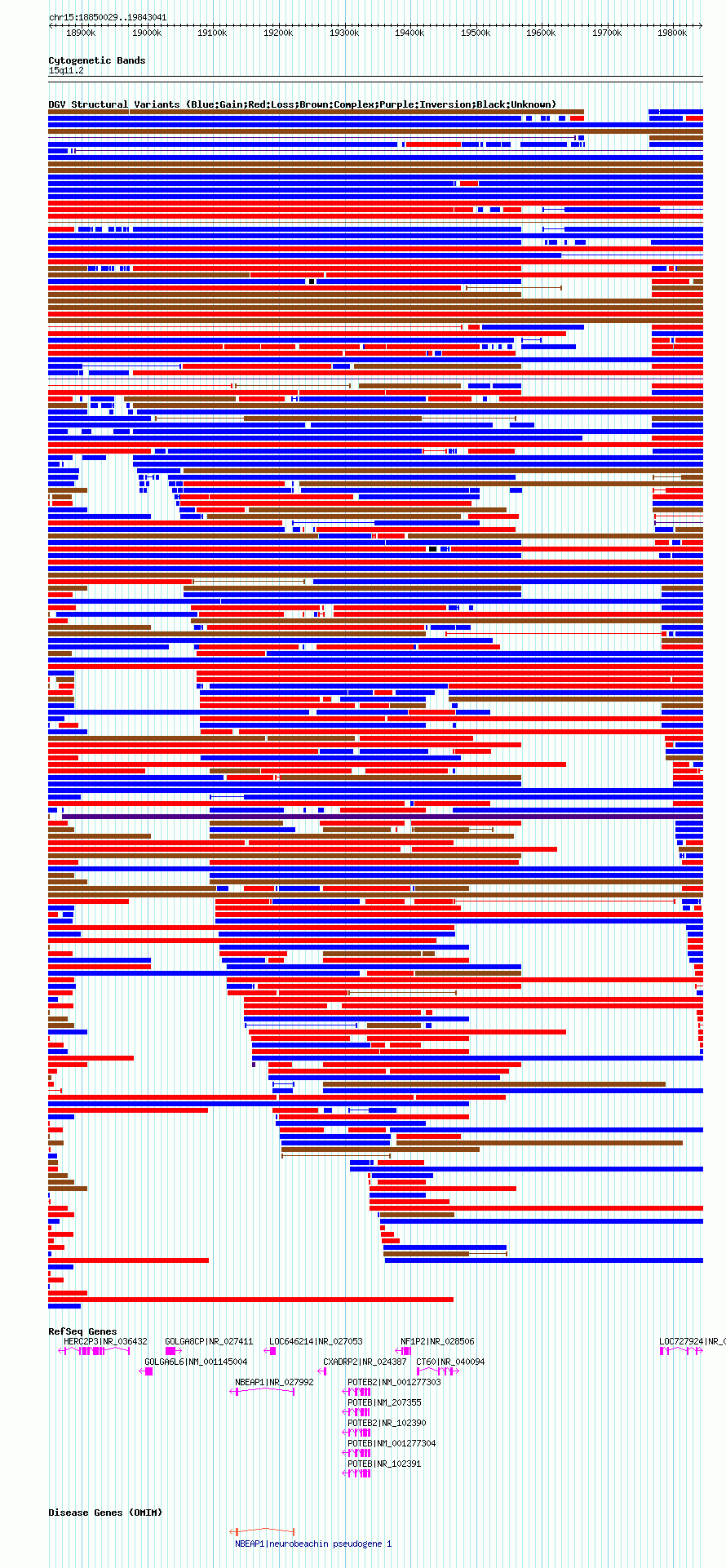 Variant DetailsVariant: nsv1043130| Internal ID | 19132349 | | Landmark | | | Location Information | | | Cytoband | 15q11.1 | | Allele length | | Assembly | Allele length | | hg38 | 1668965 | | hg19 | 1751663 | | hg18 | 993013 |