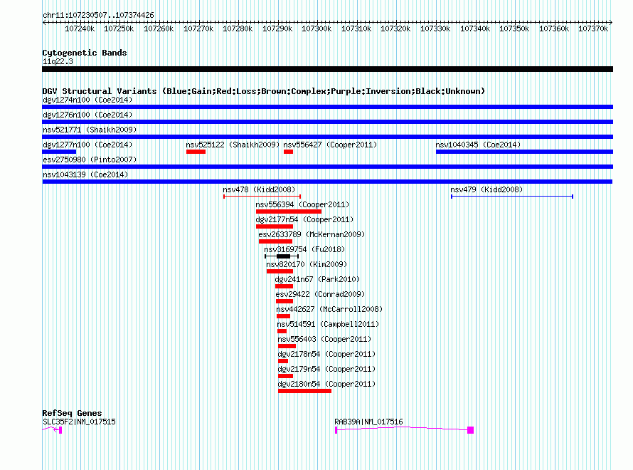 Variant DetailsVariant: nsv1043139| Internal ID | 19132358 | | Landmark | | | Location Information | | | Cytoband | 11q22.3 | | Allele length | | Assembly | Allele length | | hg38 | 143920 | | hg19 | 143920 | | hg18 | 143920 |
