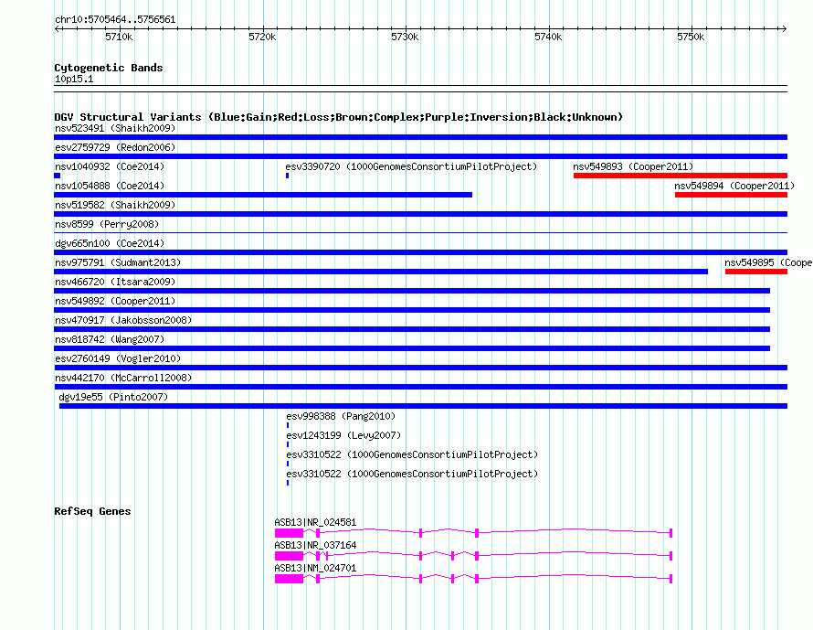 Variant DetailsVariant: nsv1043251| Internal ID | 19132470 | | Landmark | | | Location Information | | | Cytoband | 10p15.1 | | Allele length | | Assembly | Allele length | | hg38 | 51098 | | hg19 | 51098 | | hg18 | 51098 |