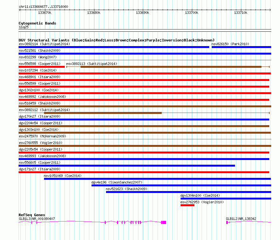 Variant DetailsVariant: nsv1043267| Internal ID | 18785798 | | Landmark | | | Location Information | | | Cytoband | 11q25 | | Allele length | | Assembly | Allele length | | hg38 | 51384 | | hg19 | 51384 | | hg18 | 51384 |