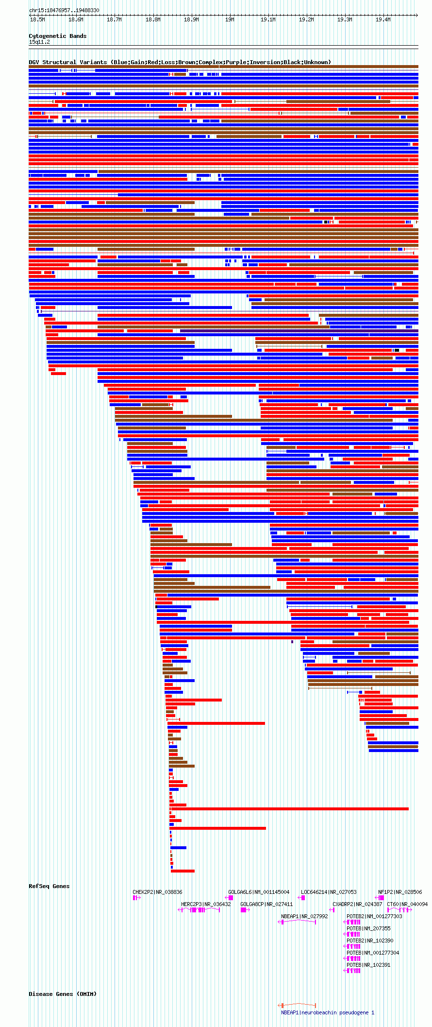 Variant DetailsVariant: nsv1043461| Internal ID | 19132680 | | Landmark | | | Location Information | | | Cytoband | 15q11.1 | | Allele length | | Assembly | Allele length | | hg38 | 1006653 | | hg19 | 1006729 | | hg18 | 1011374 |