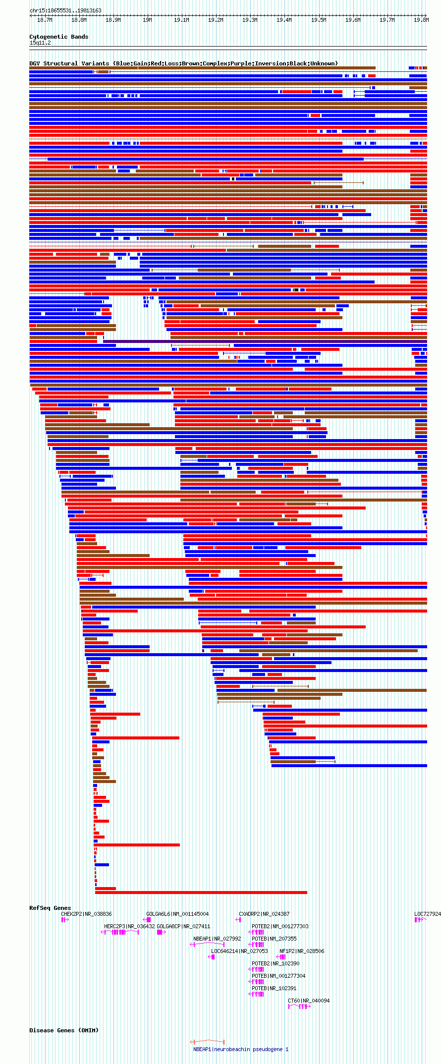 Variant DetailsVariant: nsv1043462| Internal ID | 19132681 | | Landmark | | | Location Information | | | Cytoband | 15q11.1 | | Allele length | | Assembly | Allele length | | hg38 | 1833585 | | hg19 | 1916283 | | hg18 | 1157633 |