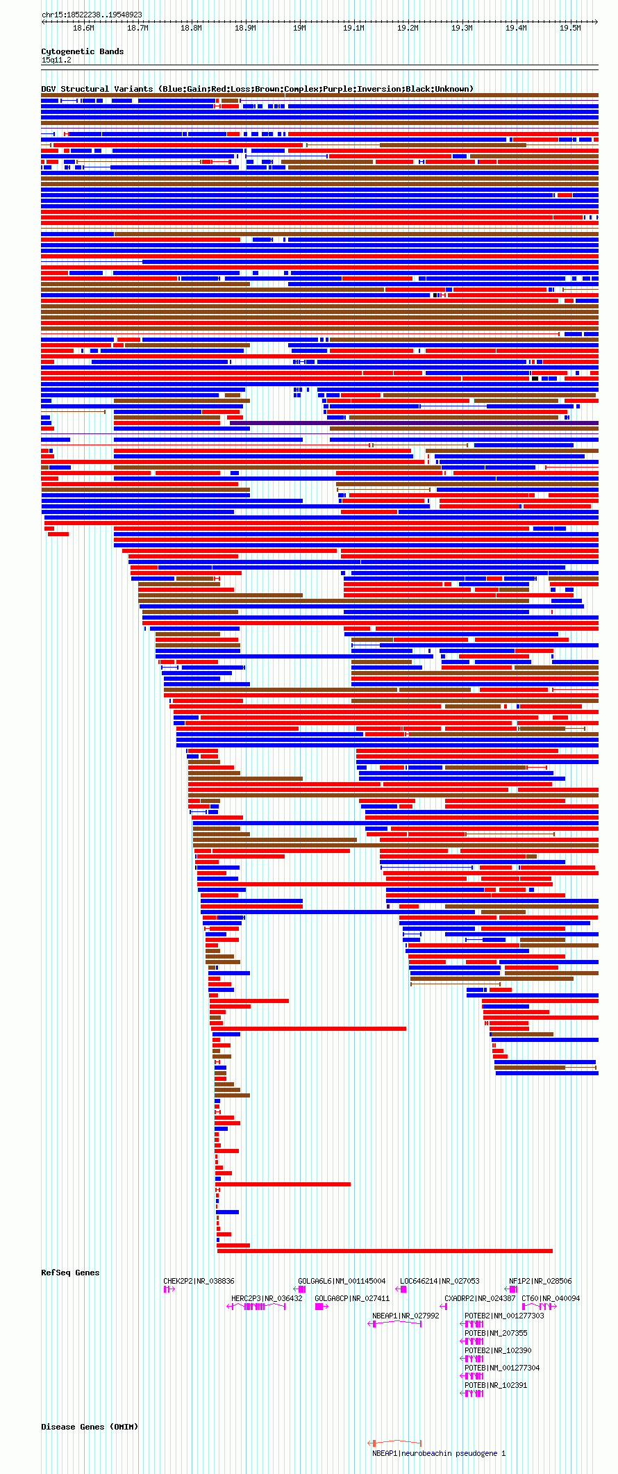 | | Variant Type | CNV gain+loss | | Copy Number | | | Allele State | | | Allele Origin | | | Probe Count | | | Validation Flag | | | Merged Status | M | | Merged Variants | dgv2189n100 | | Supporting Variants | nssv3538392, nssv3538391 | | Samples | | | Known Genes | CHEK2P2, CT60, CXADRP2, GOLGA6L6, GOLGA8CP, HERC2P3, LOC646214, NBEAP1, NF1P2, POTEB, POTEB2 | | Method | SNP array | | Analysis | Affymetrix SNP array copy number analysis | | Platform | Affymetrix SNP Array 6.0 | | Comments | | | Reference | Coe_et_al_2014 | | Pubmed ID | 25217958 | | Accession Number(s) | nsv1043657