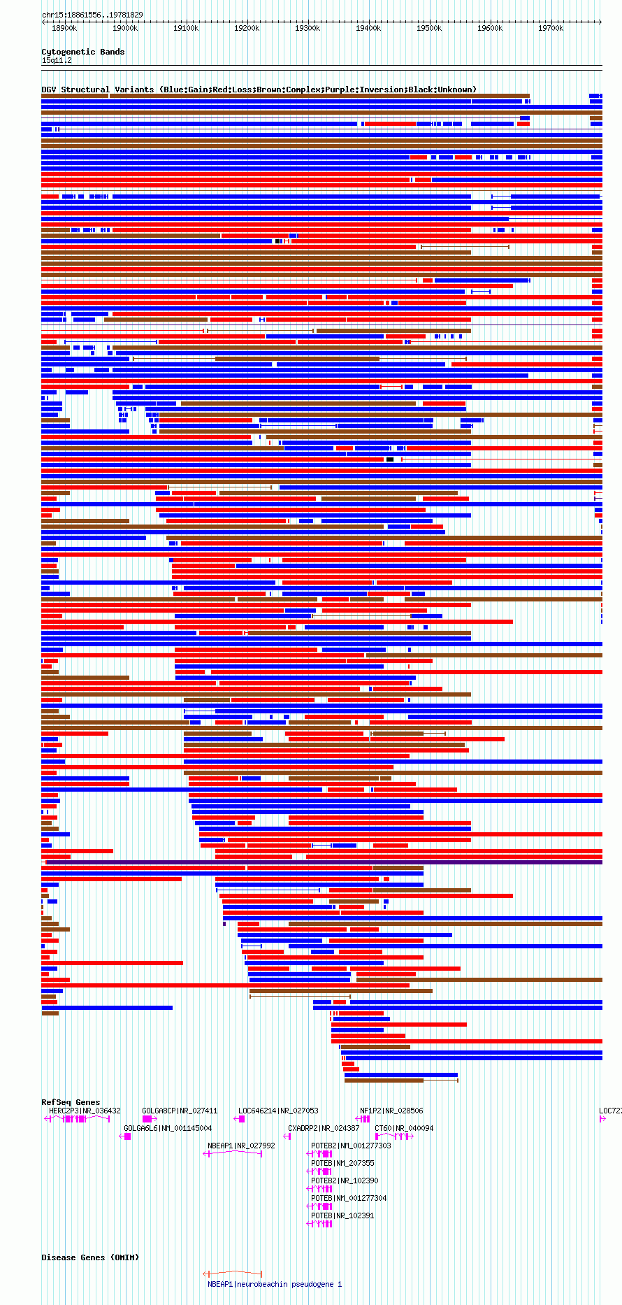 Variant DetailsVariant: nsv1043747| Internal ID | 19132966 | | Landmark | | | Location Information | | | Cytoband | 15q11.1 | | Allele length | | Assembly | Allele length | | hg38 | 1596226 | | hg19 | 1678924 | | hg18 | 920274 |