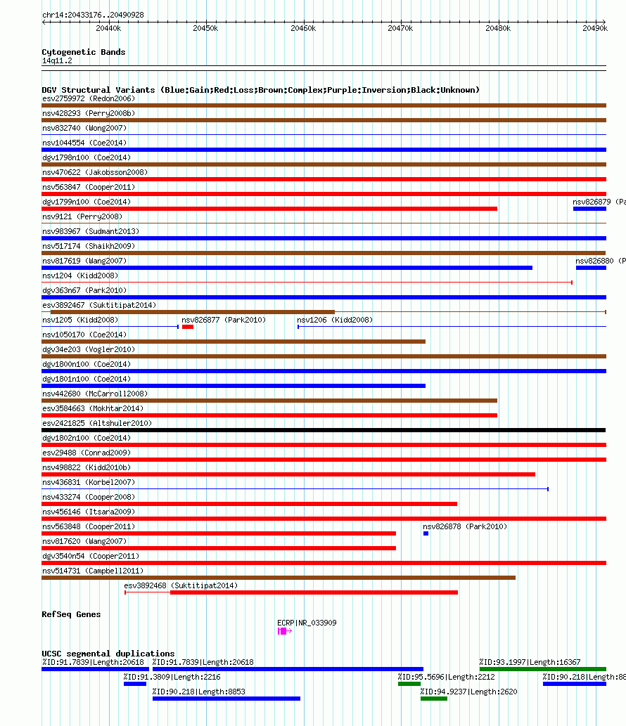 Variant DetailsVariant: nsv1043957 Internal ID | 18786488 | Landmark | | Location Information | | Cytoband | 14q11.2 | Allele length | Assembly | Allele length | hg38 | 57753 | hg19 | 57753 | hg18 | 57753 |
