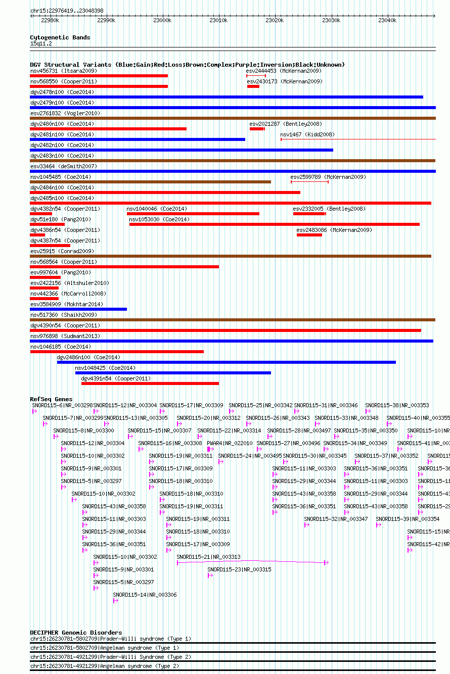| | Variant Type | CNV gain | | Copy Number | | | Allele State | | | Allele Origin | | | Probe Count | | | Validation Flag | | | Merged Status | M | | Merged Variants | dgv2479n100 | | Supporting Variants | nssv3545614, nssv3545613, nssv3545609, nssv3545611, nssv3545610, nssv3545612 | | Samples | | | Known Genes | PWAR4, SNORD115-10, SNORD115-11, SNORD115-12, SNORD115-13, SNORD115-14, SNORD115-15, SNORD115-16, SNORD115-17, SNORD115-18, SNORD115-19, SNORD115-20, SNORD115-21, SNORD115-22, SNORD115-23, SNORD115-24, SNORD115-25, SNORD115-26, SNORD115-27, SNORD115-28, SNORD115-29, SNORD115-30, SNORD115-31, SNORD115-32, SNORD115-33, SNORD115-34, SNORD115-35, SNORD115-36, SNORD115-37, SNORD115-38, SNORD115-39, SNORD115-40, SNORD115-41, SNORD115-42, SNORD115-43, SNORD115-44, SNORD115-5, SNORD115-6, SNORD115-7, SNORD115-8, SNORD115-9 | | Method | SNP array | | Analysis | Affymetrix SNP array copy number analysis | | Platform | Affymetrix SNP Array 6.0 | | Comments | | | Reference | Coe_et_al_2014 | | Pubmed ID | 25217958 | | Accession Number(s) | nsv1043993