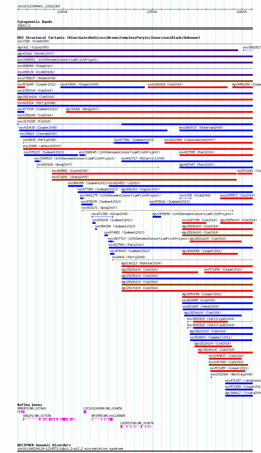 Variant DetailsVariant: nsv1044056| Internal ID | 19133275 | | Landmark | | | Location Information | | | Cytoband | 16p12.1 | | Allele length | | Assembly | Allele length | | hg38 | 261901 | | hg19 | 261901 | | hg18 | 261901 |