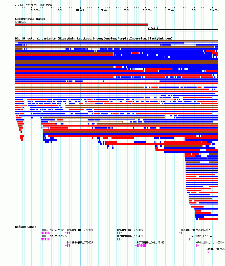 Variant DetailsVariant: nsv1044073| Internal ID | 19133292 | | Landmark | | | Location Information | | | Cytoband | 14q11.1 | | Allele length | | Assembly | Allele length | | hg38 | 1213072 | | hg19 | 904754 | | hg18 | 904594 |