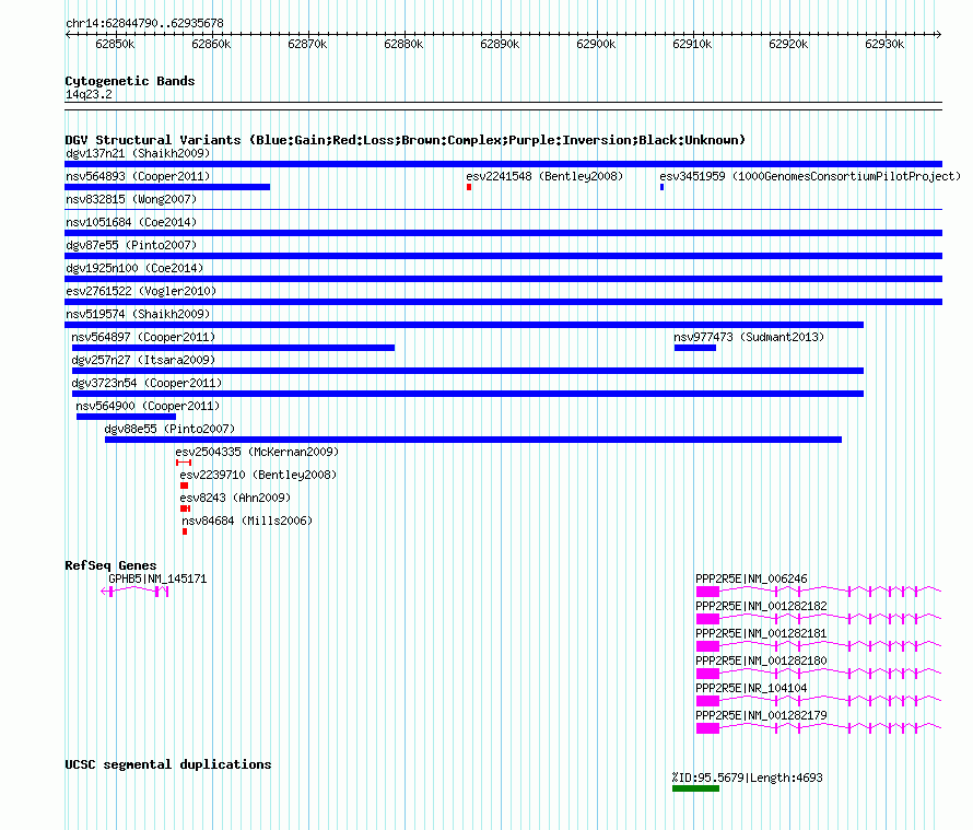 | | Variant Type | CNV gain | | Copy Number | | | Allele State | | | Allele Origin | | | Probe Count | | | Validation Flag | | | Merged Status | M | | Merged Variants | dgv1925n100 | | Supporting Variants | nssv3713505, nssv3531066, nssv3531070, nssv3531065, nssv3713504, nssv3713503, nssv3531068, nssv3531069, nssv3713506, nssv3531067 | | Samples | | | Known Genes | GPHB5, PPP2R5E | | Method | SNP array | | Analysis | Affymetrix SNP array copy number analysis | | Platform | Affymetrix SNP Array 6.0 | | Comments | | | Reference | Coe_et_al_2014 | | Pubmed ID | 25217958 | | Accession Number(s) | nsv1044094