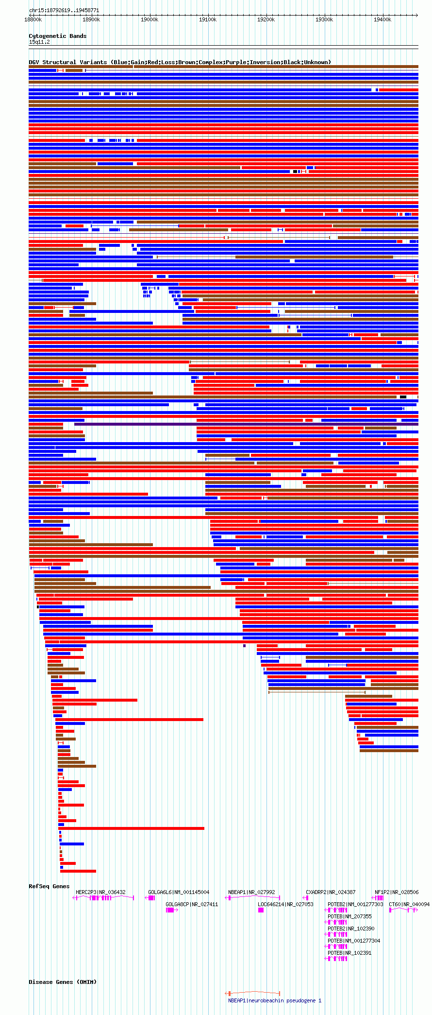 | | Variant Type | CNV gain+loss | | Copy Number | | | Allele State | | | Allele Origin | | | Probe Count | | | Validation Flag | | | Merged Status | M | | Merged Variants | dgv2246n100 | | Supporting Variants | nssv3536181, nssv3536180 | | Samples | | | Known Genes | CT60, CXADRP2, GOLGA6L6, GOLGA8CP, HERC2P3, LOC646214, NBEAP1, NF1P2, POTEB, POTEB2 | | Method | SNP array | | Analysis | Affymetrix SNP array copy number analysis | | Platform | Affymetrix SNP Array 6.0 | | Comments | | | Reference | Coe_et_al_2014 | | Pubmed ID | 25217958 | | Accession Number(s) | nsv1044173