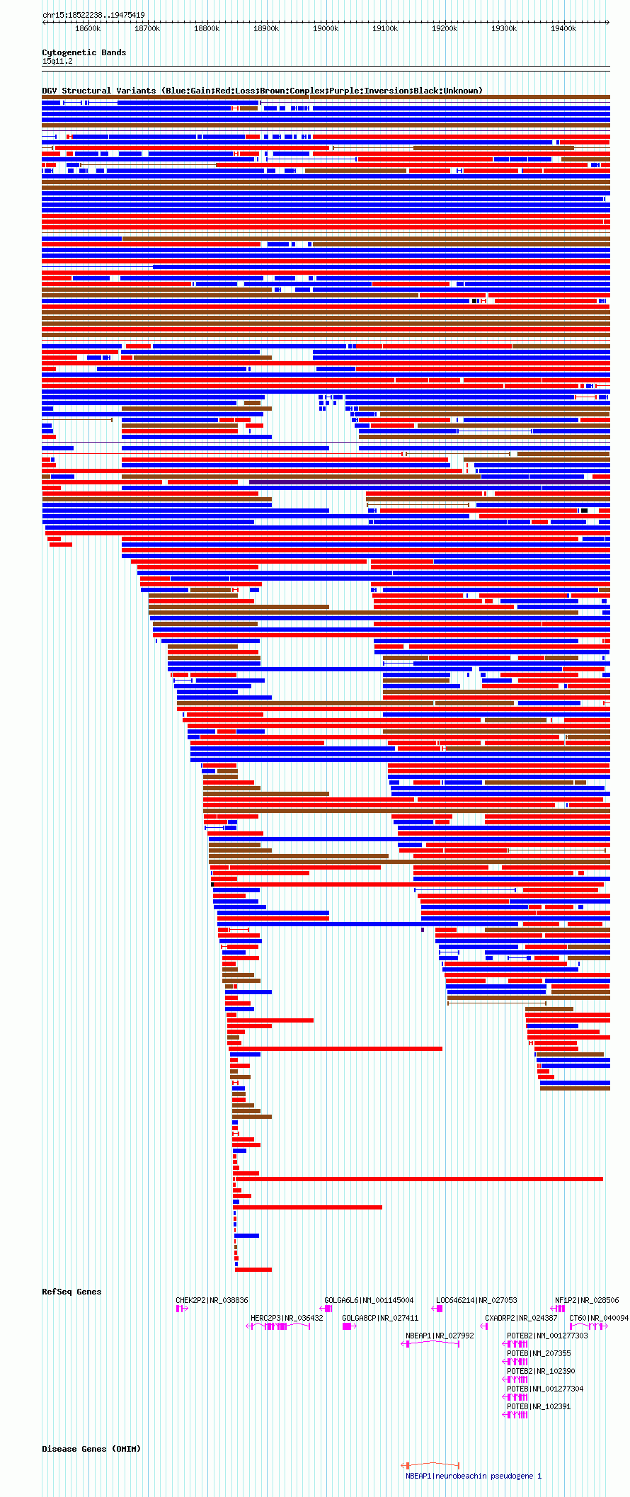 Variant DetailsVariant: nsv1044203| Internal ID | 19133422 | | Landmark | | | Location Information | | | Cytoband | 15q11.1 | | Allele length | | Assembly | Allele length | | hg38 | 948461 | | hg19 | 948537 | | hg18 | 953182 |