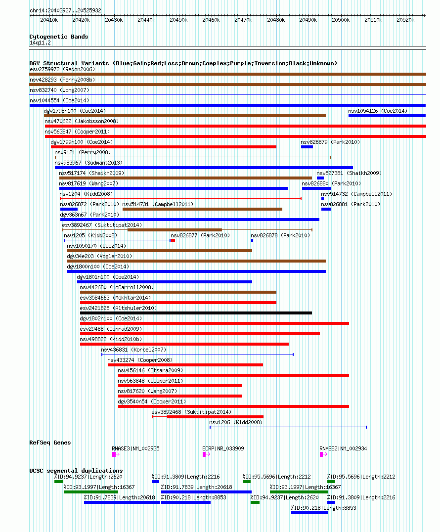 | Variant Type | CNV gain | Copy Number | | Allele State | | Allele Origin | | Probe Count | | Validation Flag | | Merged Status | M | Merged Variants | | Supporting Variants | nssv3712128 | Samples | | Known Genes | ECRP, RNASE2, RNASE3 | Method | SNP array | Analysis | Affymetrix SNP array copy number analysis | Platform | Affymetrix SNP Array 6.0 | Comments | | Reference | Coe_et_al_2014 | Pubmed ID | 25217958 | Accession Number(s) | nsv1044554