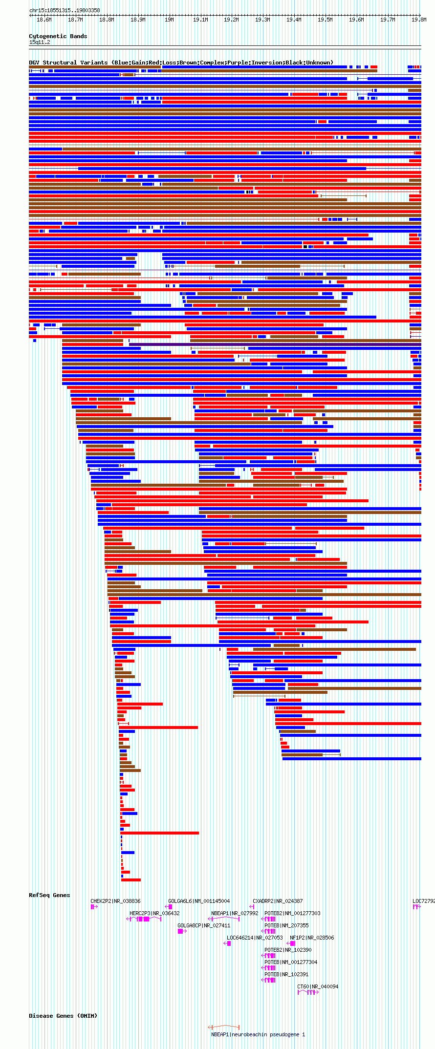 Variant DetailsVariant: nsv1044615| Internal ID | 19133834 | | Landmark | | | Location Information | | | Cytoband | 15q11.1 | | Allele length | | Assembly | Allele length | | hg38 | 1927996 | | hg19 | 2010694 | | hg18 | 1252044 |