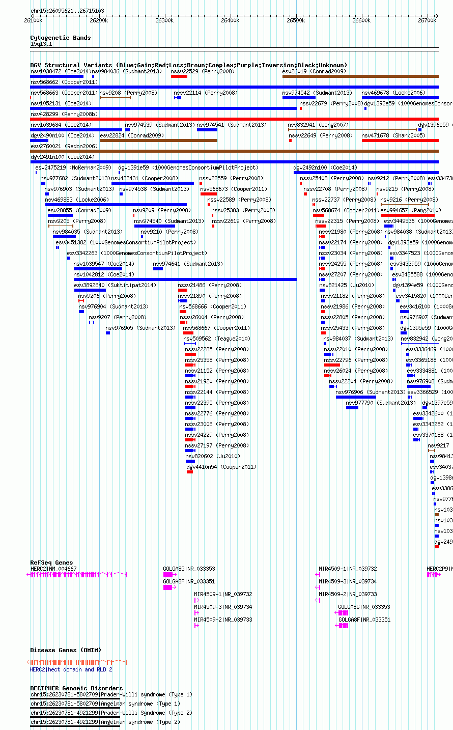 | | Variant Type | CNV gain | | Copy Number | | | Allele State | | | Allele Origin | | | Probe Count | | | Validation Flag | | | Merged Status | M | | Merged Variants | dgv2491n100 | | Supporting Variants | nssv3721470 | | Samples | | | Known Genes | GOLGA8F, GOLGA8G, HERC2, HERC2P9, MIR4509-1, MIR4509-2, MIR4509-3 | | Method | SNP array | | Analysis | Affymetrix SNP array copy number analysis | | Platform | Affymetrix SNP Array 6.0 | | Comments | | | Reference | Coe_et_al_2014 | | Pubmed ID | 25217958 | | Accession Number(s) | nsv1044648