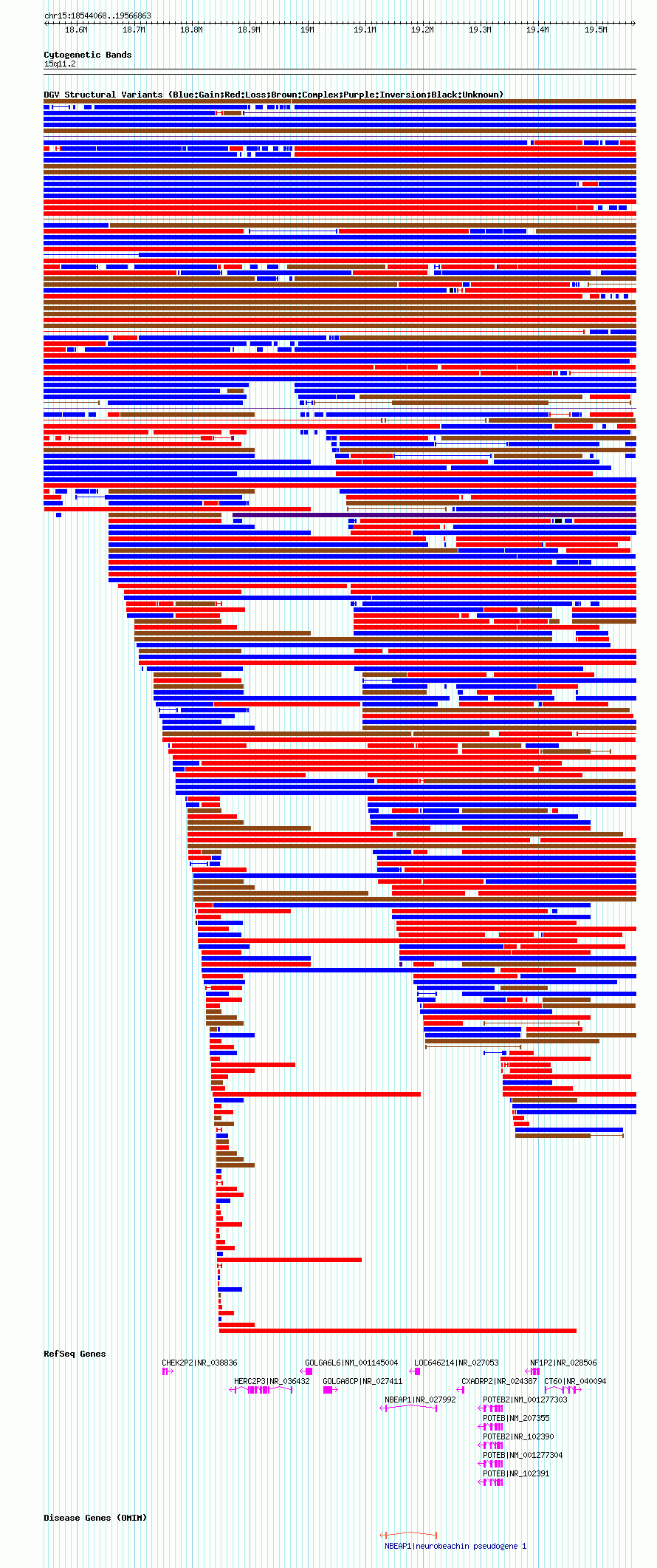 | | Variant Type | CNV gain+loss | | Copy Number | | | Allele State | | | Allele Origin | | | Probe Count | | | Validation Flag | | | Merged Status | M | | Merged Variants | dgv2189n100 | | Supporting Variants | nssv3715989, nssv3536580, nssv3536583, nssv3715990, nssv3536582, nssv3536579, nssv3536578, nssv3536584, nssv3536576, nssv3536575, nssv3536585, nssv3536581, nssv3536586, nssv3536577 | | Samples | | | Known Genes | CHEK2P2, CT60, CXADRP2, GOLGA6L6, GOLGA8CP, HERC2P3, LOC646214, NBEAP1, NF1P2, POTEB, POTEB2 | | Method | SNP array | | Analysis | Affymetrix SNP array copy number analysis | | Platform | Affymetrix SNP Array 6.0 | | Comments | | | Reference | Coe_et_al_2014 | | Pubmed ID | 25217958 | | Accession Number(s) | nsv1044813