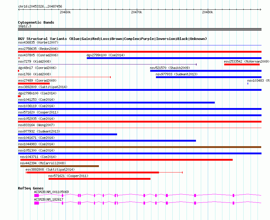 | | Variant Type | CNV gain+loss | | Copy Number | | | Allele State | | | Allele Origin | | | Probe Count | | | Validation Flag | | | Merged Status | M | | Merged Variants | | | Supporting Variants | nssv3548042, nssv3548044, nssv3548045, nssv3548040, nssv3548043, nssv3548041 | | Samples | | | Known Genes | ACSM2B | | Method | SNP array | | Analysis | Affymetrix SNP array copy number analysis | | Platform | Affymetrix SNP Array 6.0 | | Comments | | | Reference | Coe_et_al_2014 | | Pubmed ID | 25217958 | | Accession Number(s) | nsv1044983