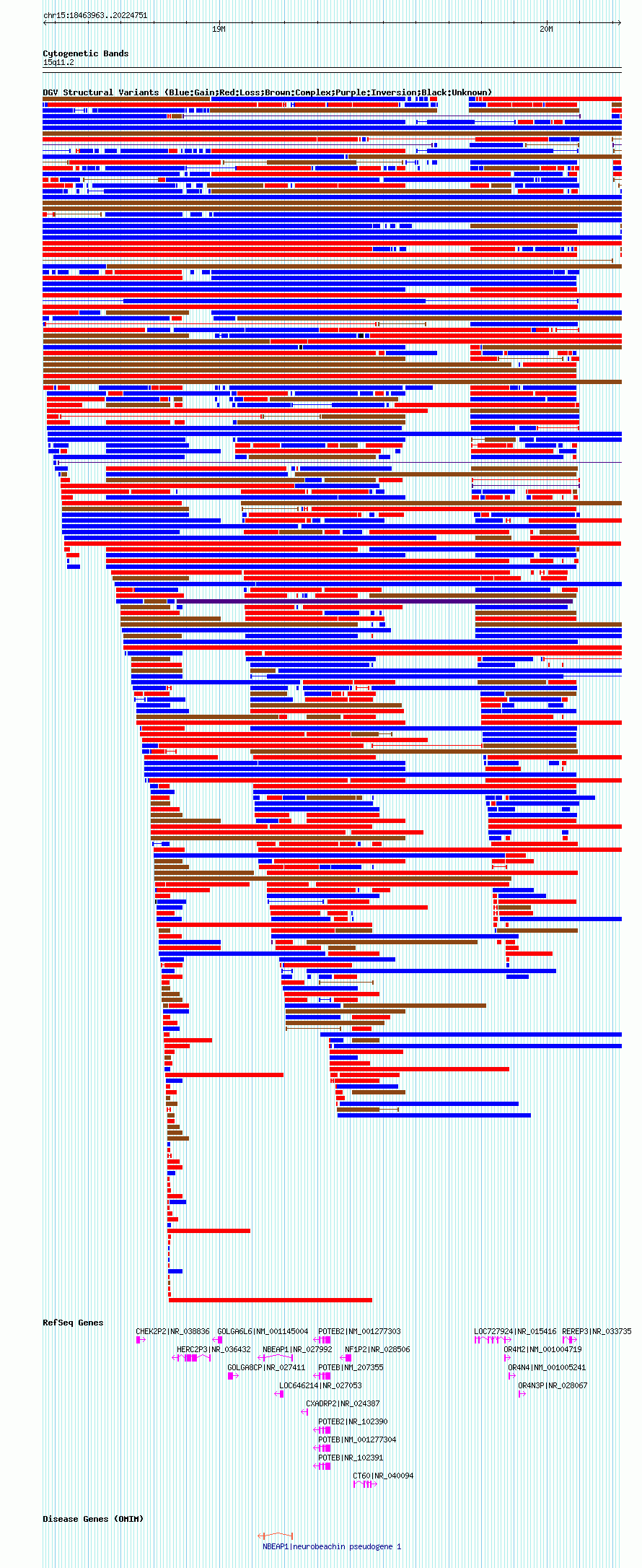 Variant DetailsVariant: nsv1044998| Internal ID | 19134217 | | Landmark | | | Location Information | | | Cytoband | 15q11.1 | | Allele length | | Assembly | Allele length | | hg38 | 2309547 | | hg19 | 2469439 | | hg18 | 1760789 |