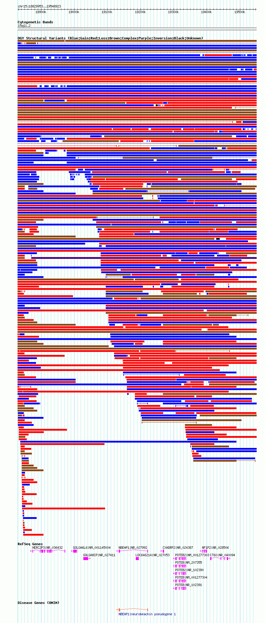 Variant DetailsVariant: nsv1045094| Internal ID | 19134313 | | Landmark | | | Location Information | | | Cytoband | 15q11.1 | | Allele length | | Assembly | Allele length | | hg38 | 714250 | | hg19 | 714326 | | hg18 | 718971 |