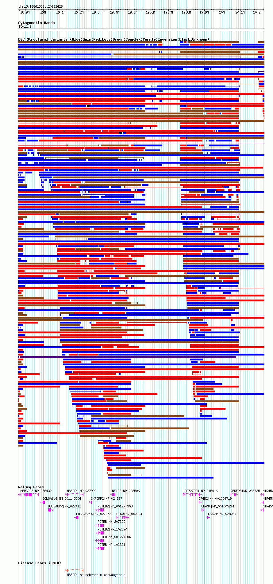 Variant DetailsVariant: nsv1045157| Internal ID | 19134376 | | Landmark | | | Location Information | | | Cytoband | 15q11.1 | | Allele length | | Assembly | Allele length | | hg38 | 1911954 | | hg19 | 2079523 | | hg18 | 1370873 |