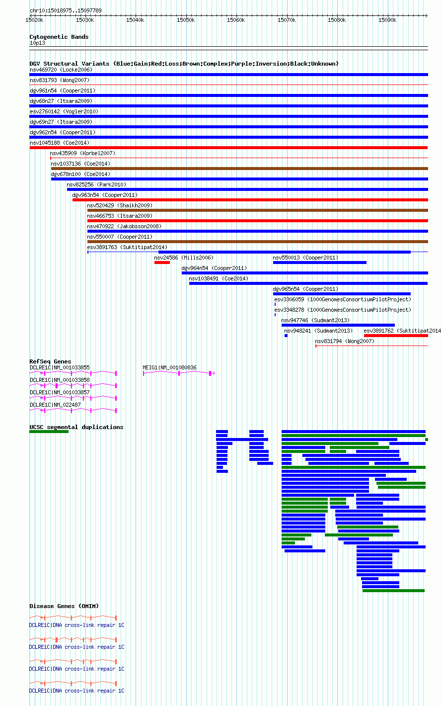 Variant DetailsVariant: nsv1045188| Internal ID | 18787719 | | Landmark | | | Location Information | | | Cytoband | 10p13 | | Allele length | | Assembly | Allele length | | hg38 | 78815 | | hg19 | 78815 | | hg18 | 78815 |
