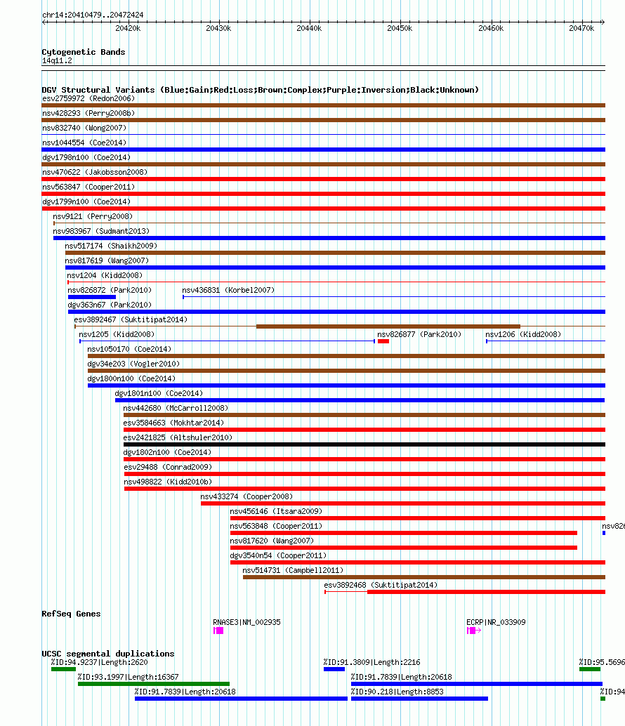 | Variant Type | CNV loss | Copy Number | | Allele State | | Allele Origin | | Probe Count | | Validation Flag | | Merged Status | M | Merged Variants | dgv1799n100 | Supporting Variants | nssv3530731, nssv3530732 | Samples | | Known Genes | ECRP, RNASE3 | Method | SNP array | Analysis | Affymetrix SNP array copy number analysis | Platform | Affymetrix SNP Array 6.0 | Comments | | Reference | Coe_et_al_2014 | Pubmed ID | 25217958 | Accession Number(s) | nsv1045451