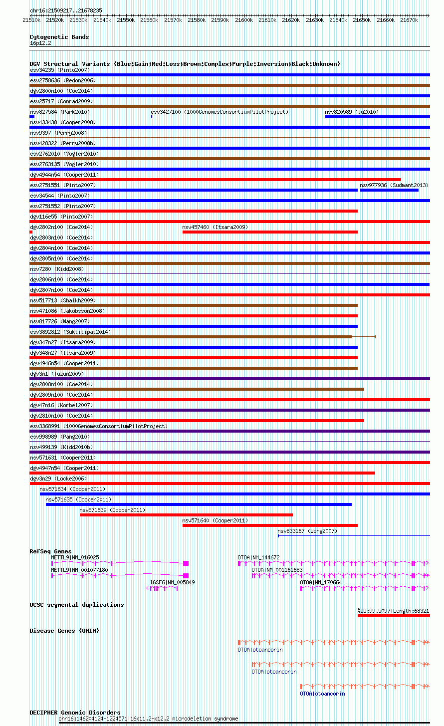 | Variant Type | CNV loss | Copy Number | | Allele State | | Allele Origin | | Probe Count | | Validation Flag | | Merged Status | M | Merged Variants | dgv2809n100 | Supporting Variants | nssv3548158 | Samples | | Known Genes | IGSF6, METTL9, OTOA | Method | SNP array | Analysis | Affymetrix SNP array copy number analysis | Platform | Affymetrix SNP Array 6.0 | Comments | | Reference | Coe_et_al_2014 | Pubmed ID | 25217958 | Accession Number(s) | nsv1045685