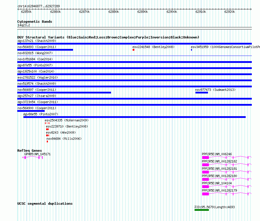 | | Variant Type | CNV gain | | Copy Number | | | Allele State | | | Allele Origin | | | Probe Count | | | Validation Flag | | | Merged Status | M | | Merged Variants | dgv1925n100 | | Supporting Variants | nssv3713507 | | Samples | | | Known Genes | GPHB5, PPP2R5E | | Method | SNP array | | Analysis | Affymetrix SNP array copy number analysis | | Platform | Affymetrix SNP Array 6.0 | | Comments | | | Reference | Coe_et_al_2014 | | Pubmed ID | 25217958 | | Accession Number(s) | nsv1045700