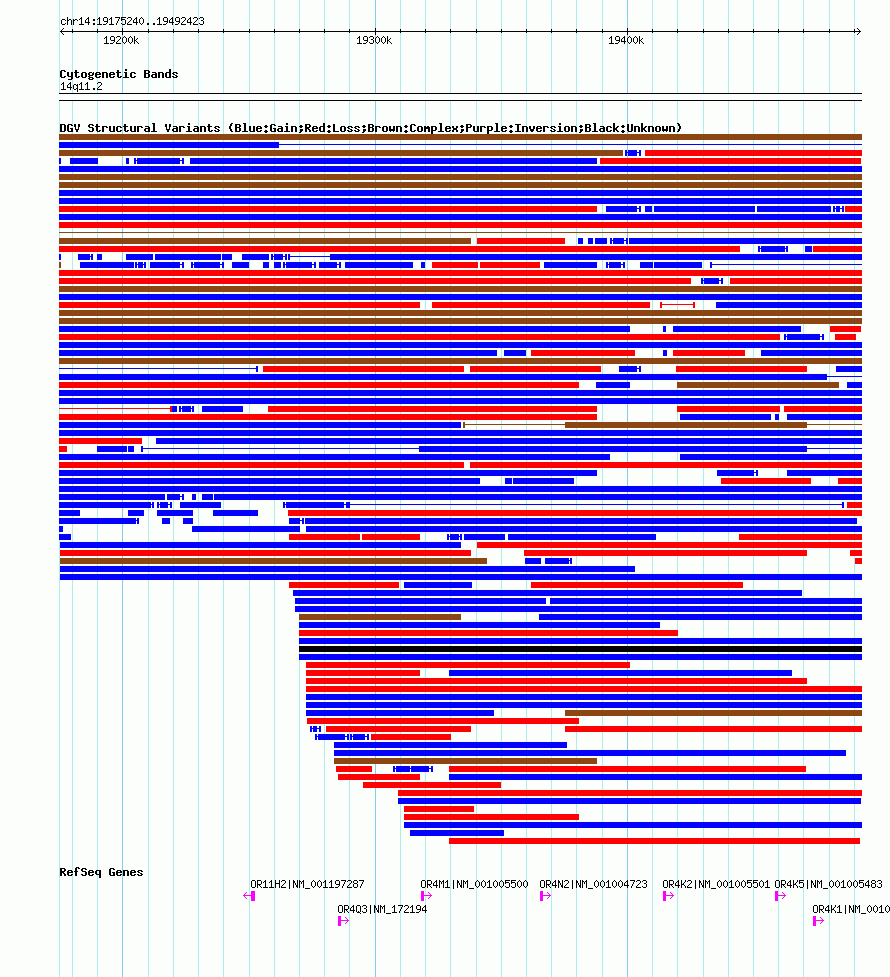 | | Variant Type | CNV gain | | Copy Number | | | Allele State | | | Allele Origin | | | Probe Count | | | Validation Flag | | | Merged Status | M | | Merged Variants | dgv1775n100 | | Supporting Variants | nssv3527517, nssv3527503, nssv3527511, nssv3711209, nssv3527506, nssv3527497, nssv3527515, nssv3527498, nssv3527493, nssv3527518, nssv3527502, nssv3711204, nssv3527519, nssv3527494, nssv3527501, nssv3527513, nssv3711208, nssv3527512, nssv3527508, nssv3527514, nssv3527509, nssv3527496, nssv3711206, nssv3527505, nssv3527499, nssv3527510, nssv3527520, nssv3527504, nssv3527516, nssv3711207, nssv3711205, nssv3527495, nssv3527500, nssv3527507 | | Samples | | | Known Genes | OR11H2, OR4K1, OR4K2, OR4K5, OR4M1, OR4N2, OR4Q3 | | Method | SNP array | | Analysis | Affymetrix SNP array copy number analysis | | Platform | Affymetrix SNP Array 6.0 | | Comments | | | Reference | Coe_et_al_2014 | | Pubmed ID | 25217958 | | Accession Number(s) | nsv1045705