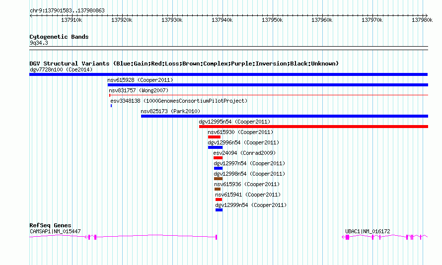 | | Variant Type | CNV gain | | Copy Number | | | Allele State | | | Allele Origin | | | Probe Count | | | Validation Flag | | | Merged Status | M | | Merged Variants | dgv7728n100 | | Supporting Variants | nssv3696506 | | Samples | | | Known Genes | CAMSAP1, UBAC1 | | Method | SNP array | | Analysis | Affymetrix SNP array copy number analysis | | Platform | Affymetrix SNP Array 6.0 | | Comments | | | Reference | Coe_et_al_2014 | | Pubmed ID | 25217958 | | Accession Number(s) | nsv1045708