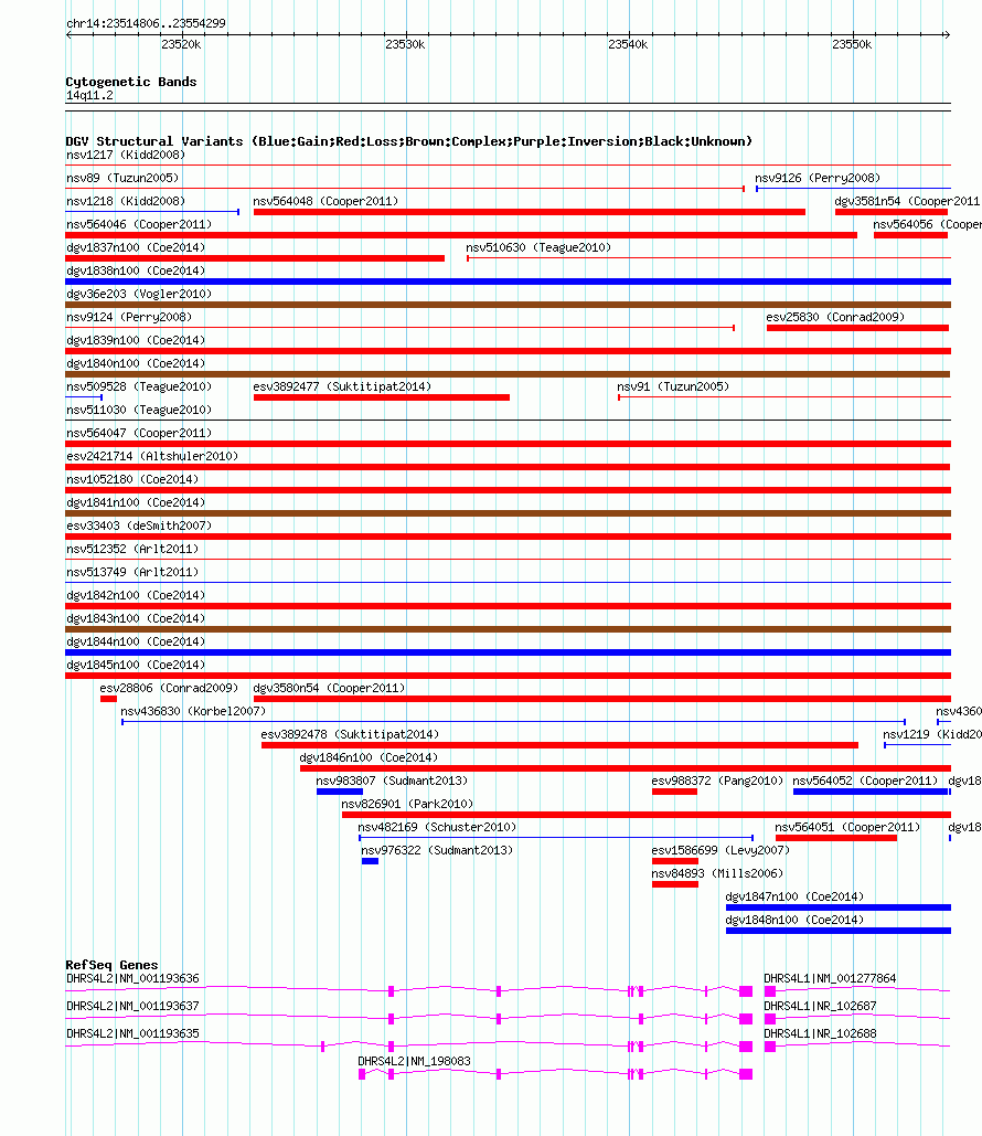 Variant DetailsVariant: nsv1045744| Internal ID | 19134963 | | Landmark | | | Location Information | | | Cytoband | 14q11.2 | | Allele length | | Assembly | Allele length | | hg38 | 39494 | | hg19 | 39494 | | hg18 | 39494 |