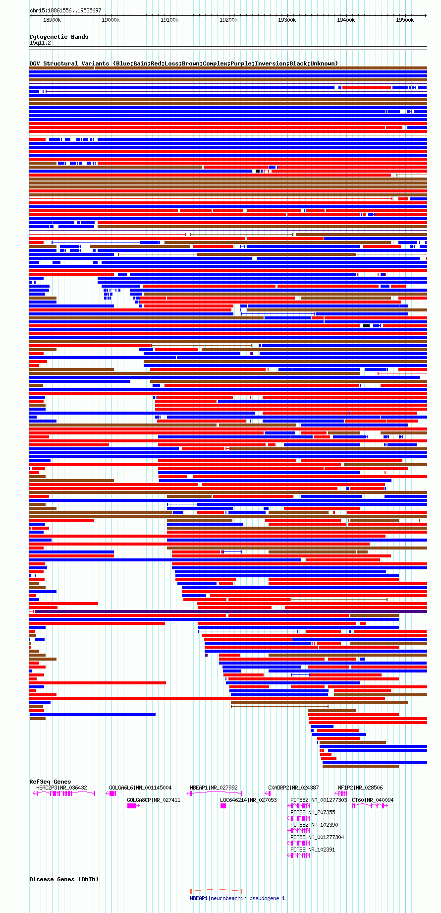 Variant DetailsVariant: nsv1045795| Internal ID | 19135014 | | Landmark | | | Location Information | | | Cytoband | 15q11.1 | | Allele length | | Assembly | Allele length | | hg38 | 669421 | | hg19 | 669497 | | hg18 | 674142 |