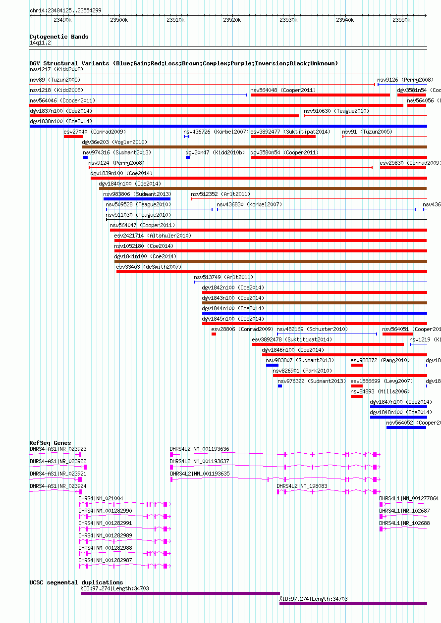 Variant DetailsVariant: nsv1045802| Internal ID | 18788333 | | Landmark | | | Location Information | | | Cytoband | 14q11.2 | | Allele length | | Assembly | Allele length | | hg38 | 70175 | | hg19 | 70175 | | hg18 | 70175 |