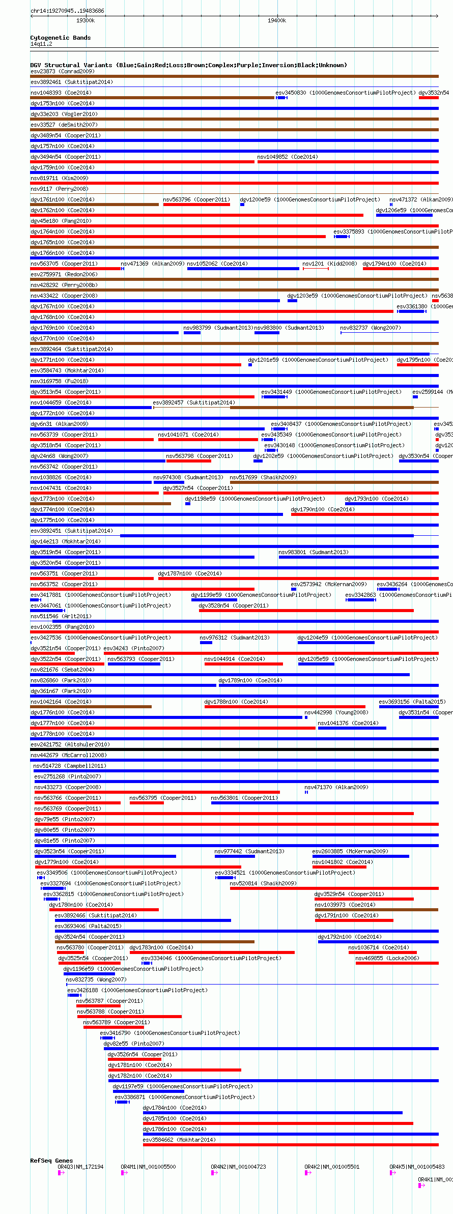 Variant DetailsVariant: nsv1045848| Internal ID | 19135067 | | Landmark | | | Location Information | | | Cytoband | 14q11.2 | | Allele length | | Assembly | Allele length | | hg38 | 212742 | | hg19 | 212742 | | hg18 | 212742 |