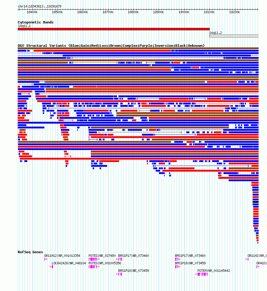 Variant DetailsVariant: nsv1045892| Internal ID | 19135111 | | Landmark | | | Location Information | | | Cytoband | 14q11.1 | | Allele length | | Assembly | Allele length | | hg38 | 1256545 | | hg19 | 948227 | | hg18 | 948067 |