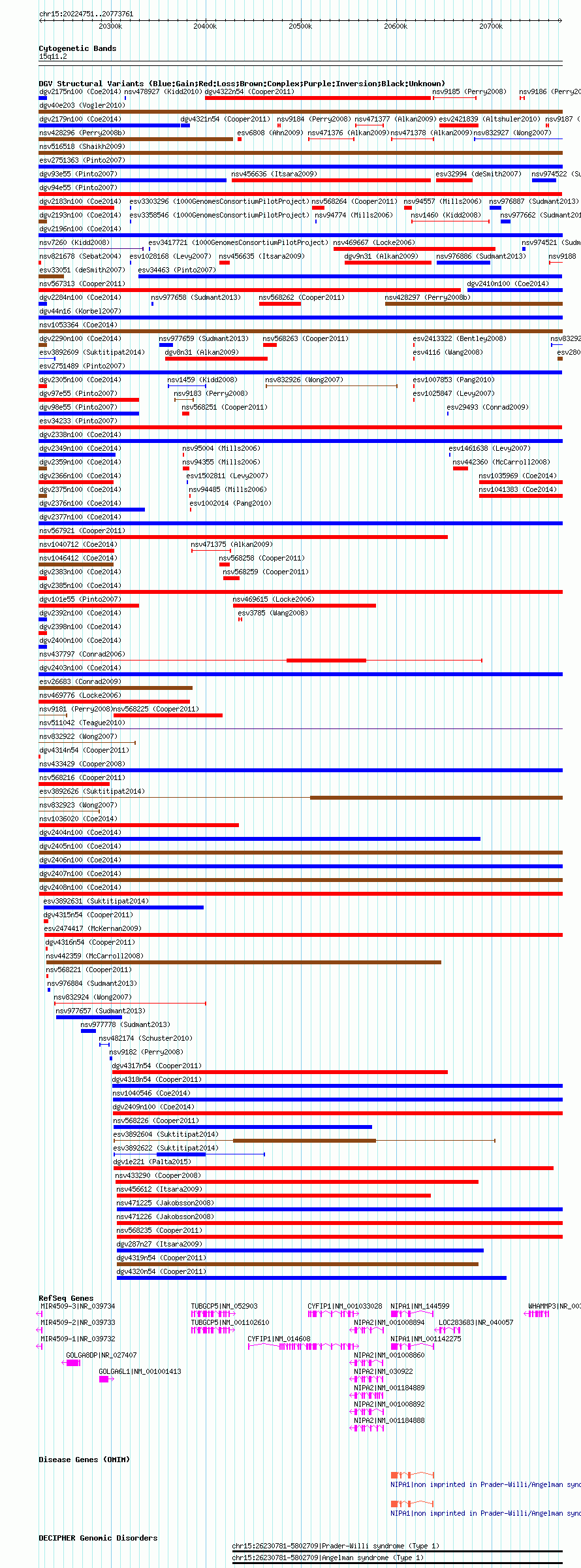 Variant DetailsVariant: nsv1046003| Internal ID | 19135222 | | Landmark | | | Location Information | | | Cytoband | 15q11.2 | | Allele length | | Assembly | Allele length | | hg38 | 548906 | | hg19 | 548934 | | hg18 | 549011 |