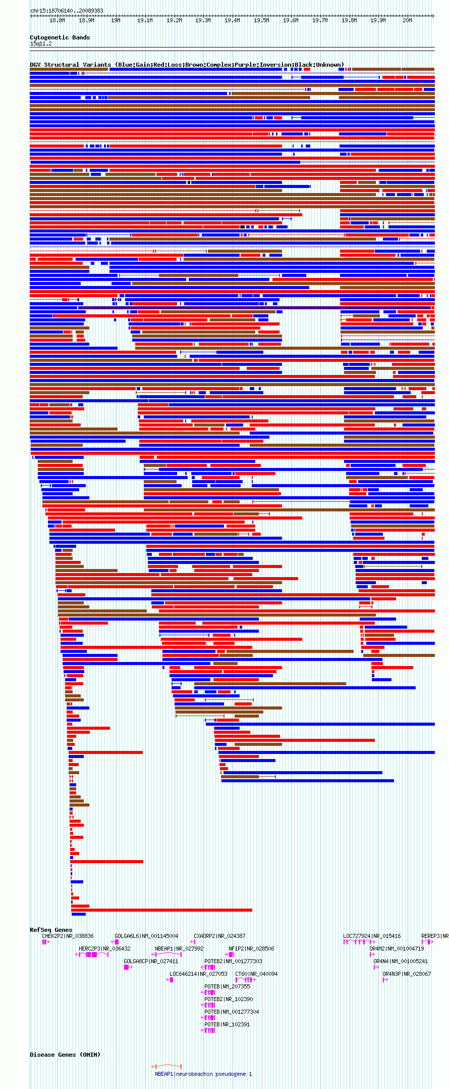 Variant DetailsVariant: nsv1046016 | Internal ID | 19135235 | | Landmark | | | Location Information | | | Cytoband | 15q11.1 | | Allele length | | Assembly | Allele length | | hg38 | 2059196 | | hg19 | 2141894 | | hg18 | 1383244 |