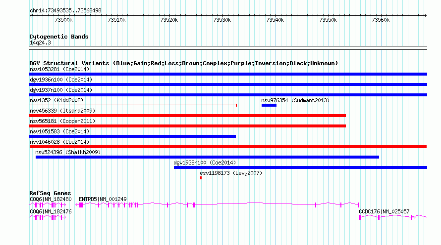 | | Variant Type | CNV loss | | Copy Number | | | Allele State | | | Allele Origin | | | Probe Count | | | Validation Flag | | | Merged Status | M | | Merged Variants | | | Supporting Variants | nssv3531158 | | Samples | | | Known Genes | CCDC176, COQ6, ENTPD5 | | Method | SNP array | | Analysis | Affymetrix SNP array copy number analysis | | Platform | Affymetrix SNP Array 6.0 | | Comments | | | Reference | Coe_et_al_2014 | | Pubmed ID | 25217958 | | Accession Number(s) | nsv1046028