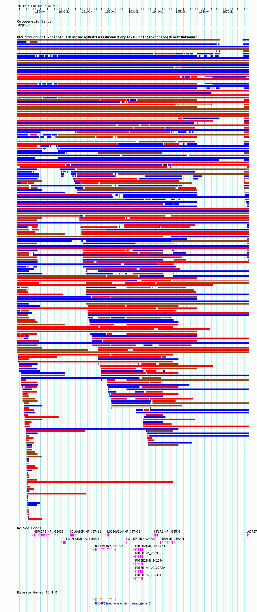Variant DetailsVariant: nsv1046051| Internal ID | 19135270 | | Landmark | | | Location Information | | | Cytoband | 15q11.1 | | Allele length | | Assembly | Allele length | | hg38 | 1661092 | | hg19 | 1743790 | | hg18 | 985140 |