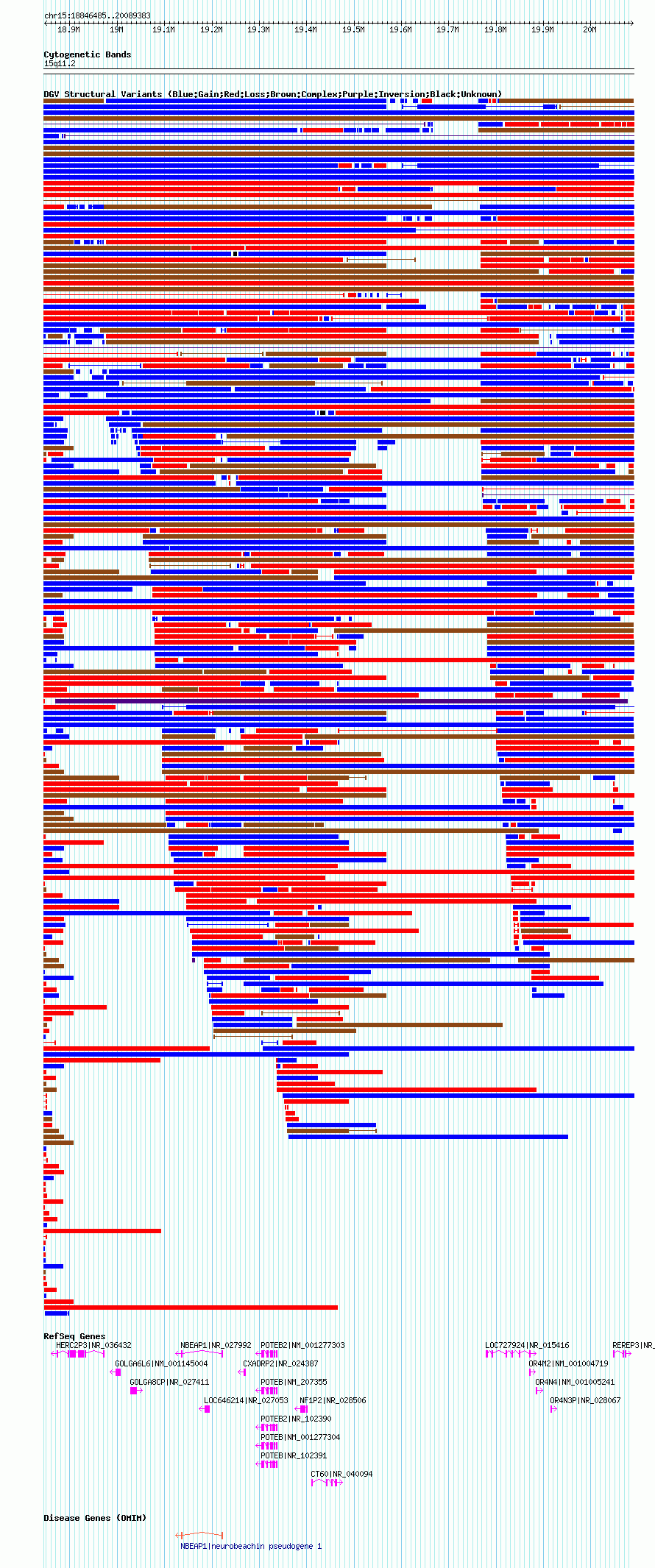 Variant DetailsVariant: nsv1046073| Internal ID | 19135292 | | Landmark | | | Location Information | | | Cytoband | 15q11.1 | | Allele length | | Assembly | Allele length | | hg38 | 1918851 | | hg19 | 2001549 | | hg18 | 1242899 |