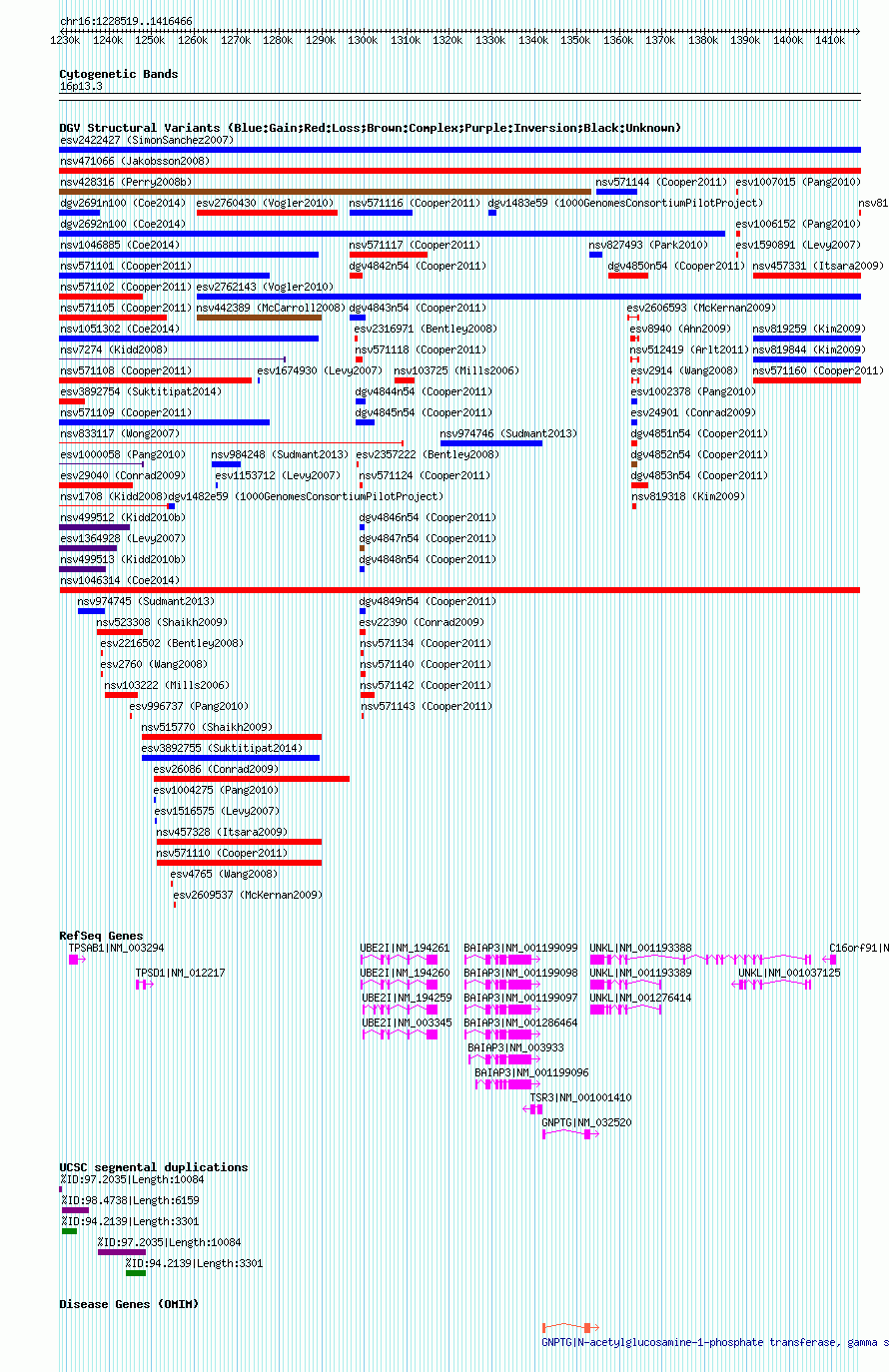 Variant DetailsVariant: nsv1046314| Internal ID | 18788845 | | Landmark | | | Location Information | | | Cytoband | 16p13.3 | | Allele length | | Assembly | Allele length | | hg38 | 187948 | | hg19 | 187948 | | hg18 | 187948 |