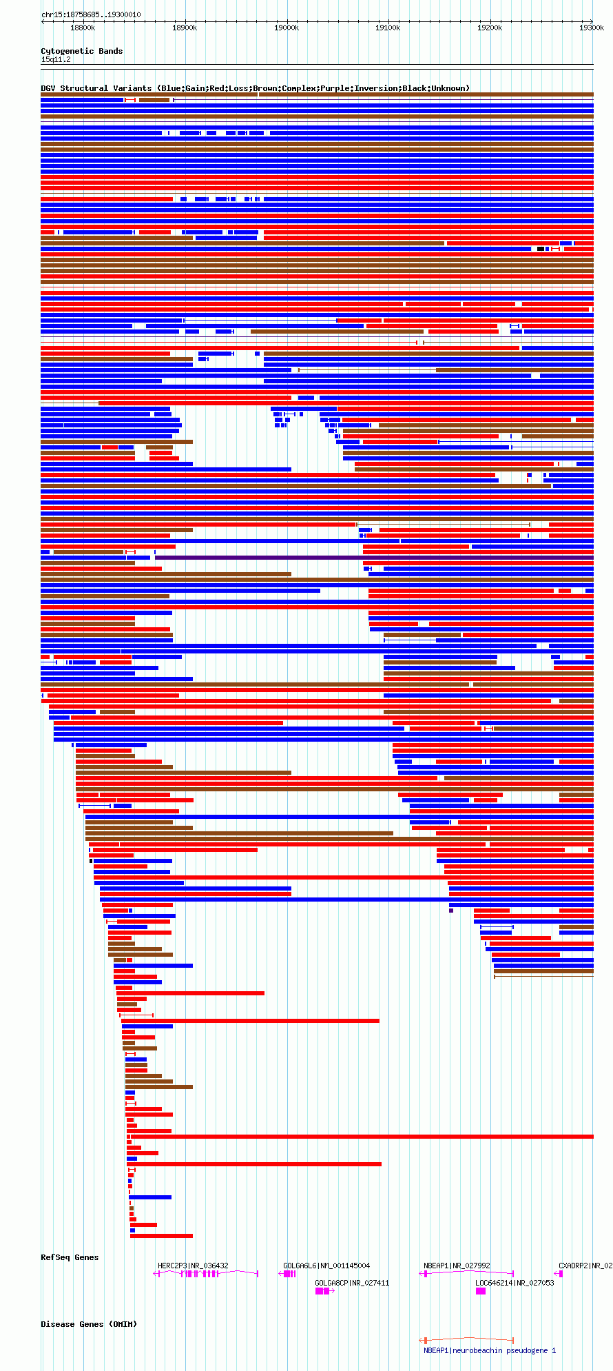 Variant DetailsVariant: nsv1046346| Internal ID | 19135565 | | Landmark | | | Location Information | | | Cytoband | 15q11.1 | | Allele length | | Assembly | Allele length | | hg38 | 536737 | | hg19 | 536813 | | hg18 | 541326 |