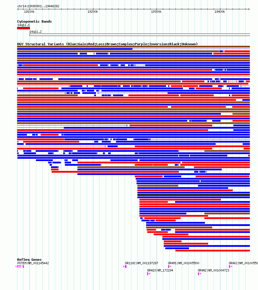 Variant DetailsVariant: nsv1046436| Internal ID | 19135655 | | Landmark | | | Location Information | | | Cytoband | 14q11.1 | | Allele length | | Assembly | Allele length | | hg38 | 483324 | | hg19 | 365542 | | hg18 | 365382 |