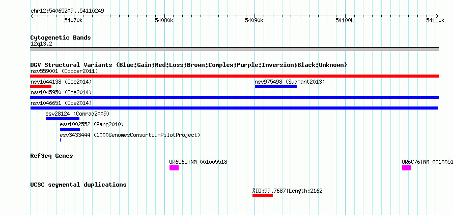 Variant DetailsVariant: nsv1046651| Internal ID | 18789182 | | Landmark | | | Location Information | | | Cytoband | 12q13.2 | | Allele length | | Assembly | Allele length | | hg38 | 45041 | | hg19 | 45041 | | hg18 | 45041 |
