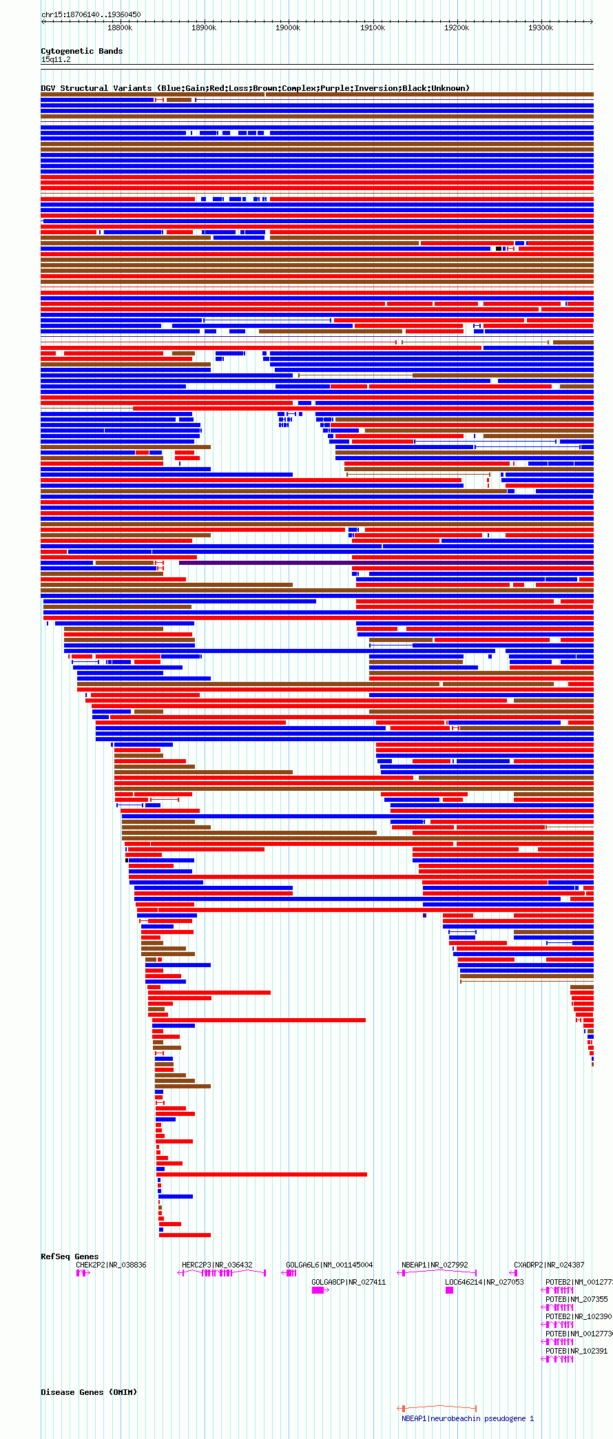 | | Variant Type | CNV gain | | Copy Number | | | Allele State | | | Allele Origin | | | Probe Count | | | Validation Flag | | | Merged Status | M | | Merged Variants | dgv2210n100 | | Supporting Variants | nssv3534735 | | Samples | | | Known Genes | CHEK2P2, CXADRP2, GOLGA6L6, GOLGA8CP, HERC2P3, LOC646214, NBEAP1, POTEB, POTEB2 | | Method | SNP array | | Analysis | Affymetrix SNP array copy number analysis | | Platform | Affymetrix SNP Array 6.0 | | Comments | | | Reference | Coe_et_al_2014 | | Pubmed ID | 25217958 | | Accession Number(s) | nsv1046721