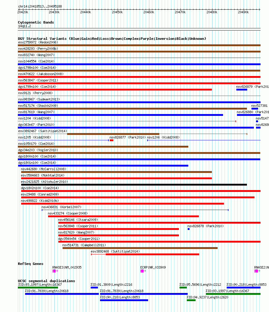 | Variant Type | CNV gain | Copy Number | | Allele State | | Allele Origin | | Probe Count | | Validation Flag | | Merged Status | M | Merged Variants | dgv1800n100 | Supporting Variants | nssv3530748, nssv3530749, nssv3530750 | Samples | | Known Genes | ECRP, RNASE2, RNASE3 | Method | SNP array | Analysis | Affymetrix SNP array copy number analysis | Platform | Affymetrix SNP Array 6.0 | Comments | | Reference | Coe_et_al_2014 | Pubmed ID | 25217958 | Accession Number(s) | nsv1047033